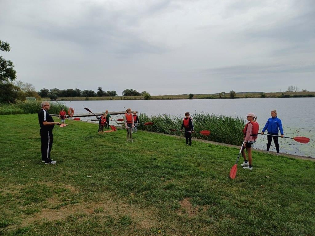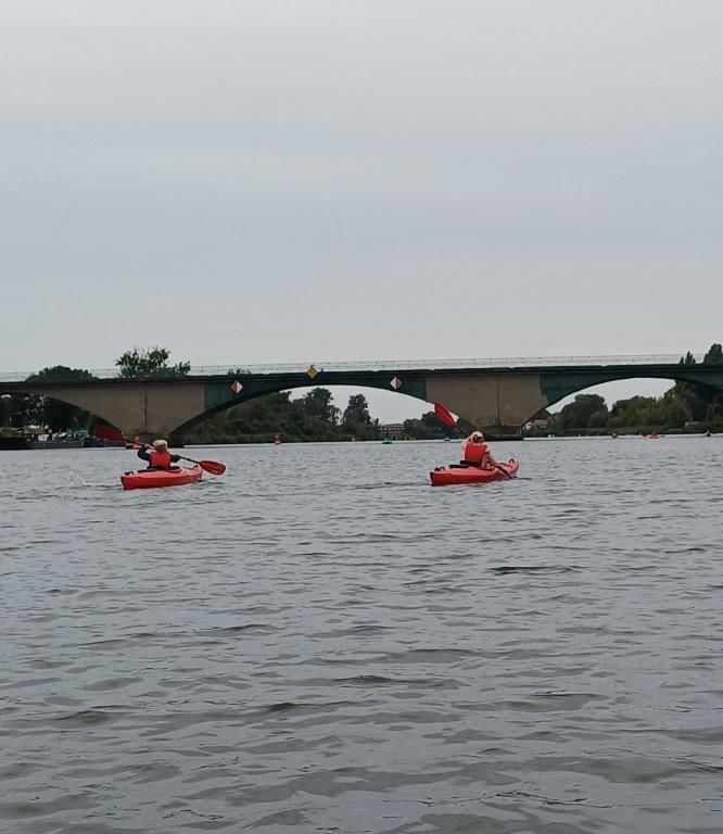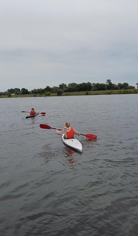 Nach der Vermittlung der Grundkenntnisse an Land unter Anleitung von Michael und Romy Tümmler ging es sogleich aufs Wasser. In den roten, stabilen Wanderkajaks meisterten alle die Runde bis zur Flussbadestelle ohne Probleme. Danach konnte, wer wollte, jeder sich noch in den Anfänger-Kajaks der Rennsportler ausprobieren. Auch hier waren viele mutige Jungs und Mädchen dabei, die allesamt trocken blieben.