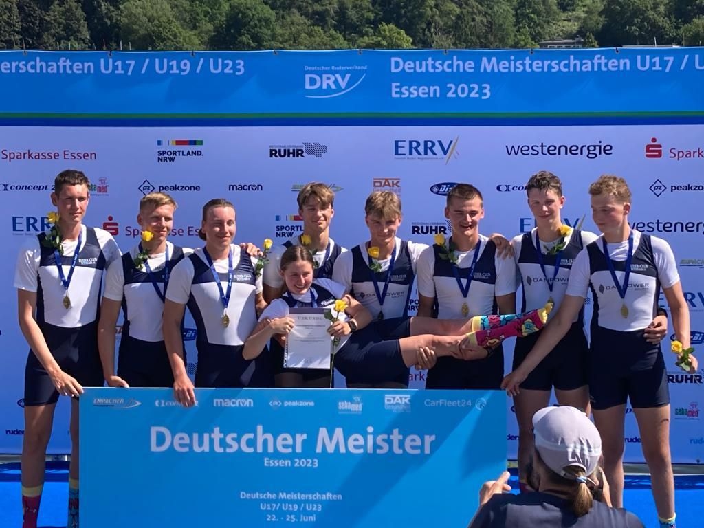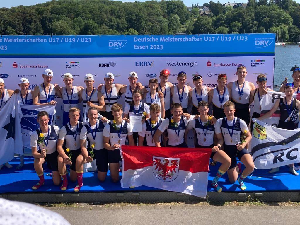 Obwohl die erste Medaille errungen war, blieb der Kampfeswille ungebrochen. Die Taktik war nun, mit aller Kraft starten, das Boot vom Feld absetzen und als Erster ins Ziel fahren. Alle bissen die Zähne zusammen, konzentrierten sich trotz des hohen Tempos über die 1.500 m Schlag für Schlag. So gelang das scheinbar Unerreichbare – der Achter des Landesruderverbandes Brandenburg mit dem Schwedter Ruderer Ben Wegner m Boot wurde Deutscher Meister im Jahrgang der unter 17 Jährigen in einer Zeit von 4:34.36 min und damit mit knapp 2 sec. vor Platz 2.