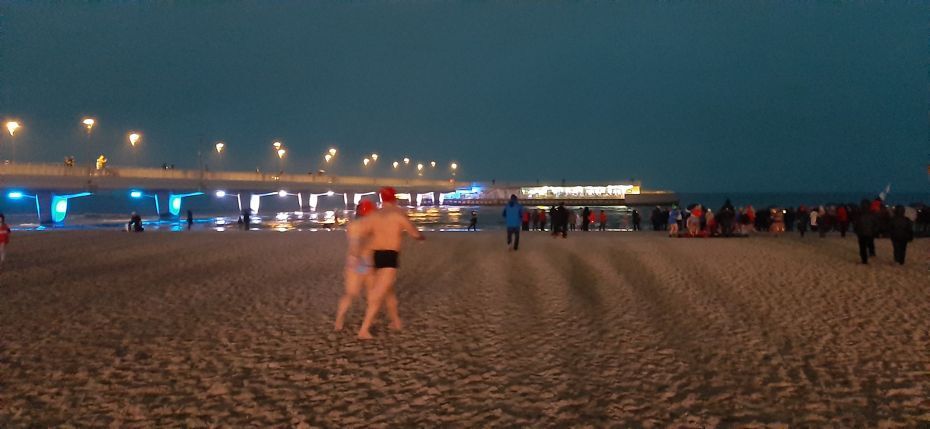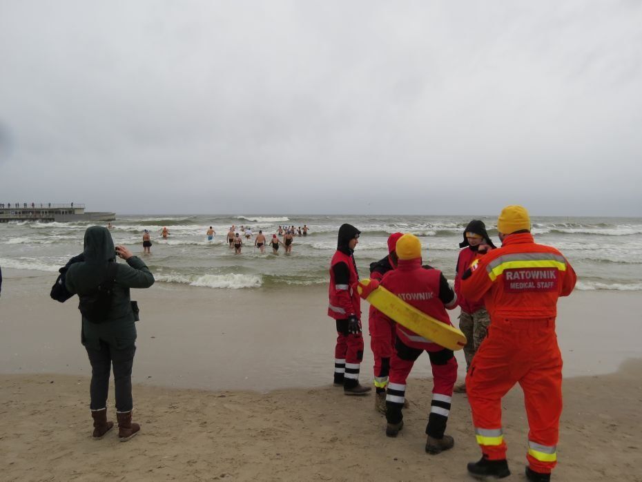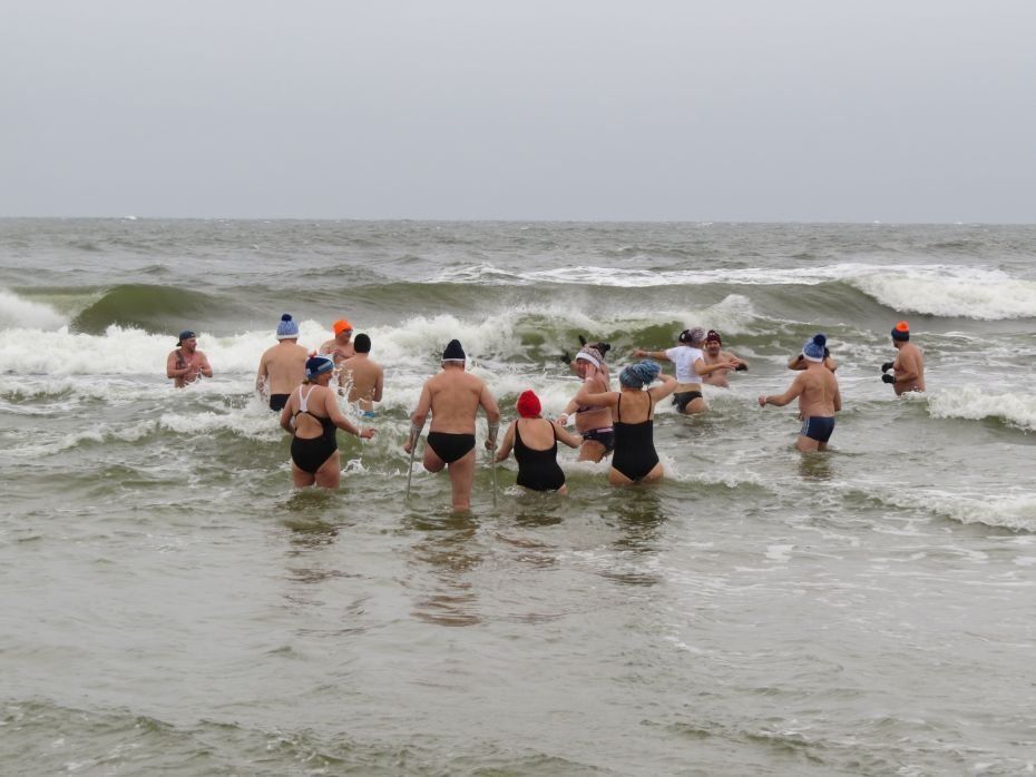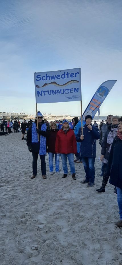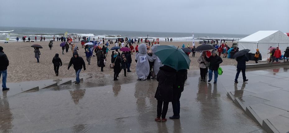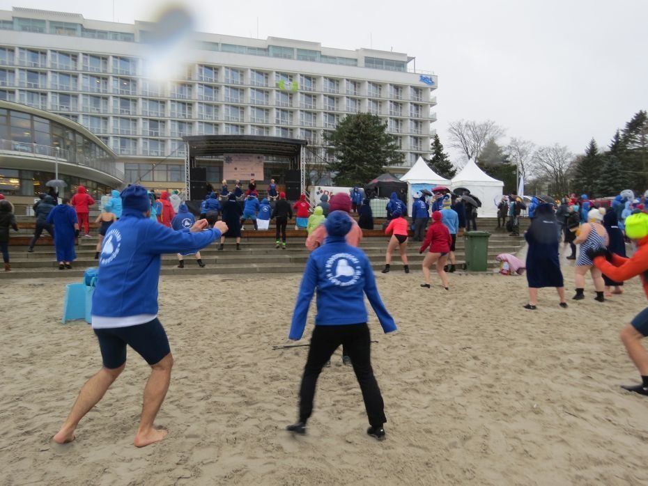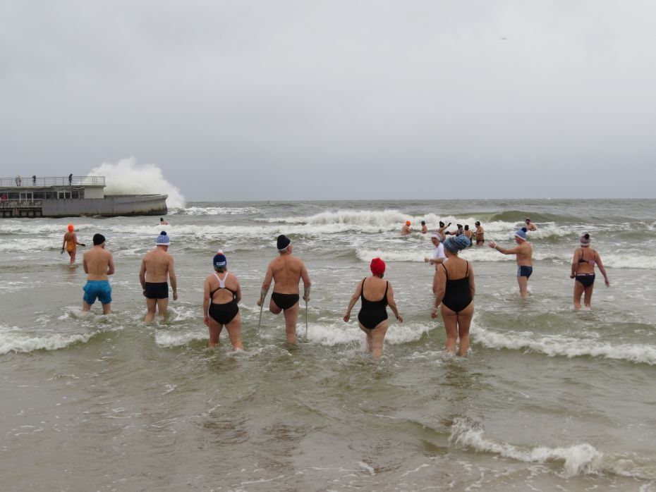 Am zentralen Strand an der Seebrücke trafen sich zahlreiche Eisbader verschiedener vor allem polnischer Vereine. Aus Deutschland waren nur die Schwedter Wassersportler angereist. Leider spielte das Wetter nicht ganz so mit. Es regnete am Freitag und Samstag fast durchgängig. Hoher Wellengang machte das Baden auch nicht einfacher. Aber Eisbader haben damit kein Problem. Gemeinsam mit Hunderten Gleichgesinnten stürzten sich auch unsere „Schwedter Neunaugen“ mehrmals ins Wasser. Die restliche Schwedter Delegation beobachtete in regenfester Kleidung mit Respekt das bunter Treiben.
