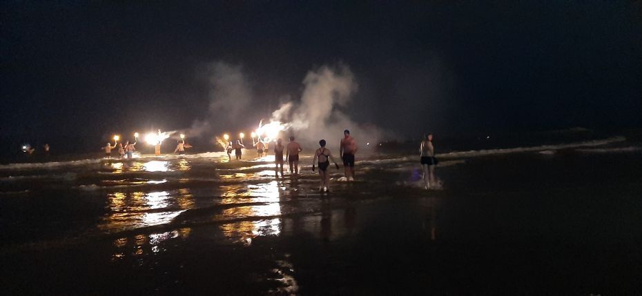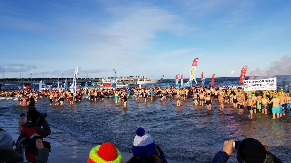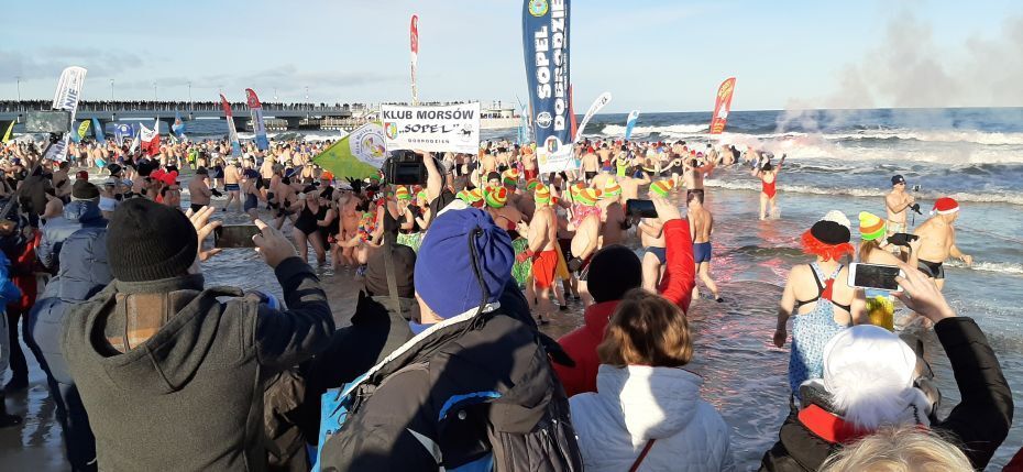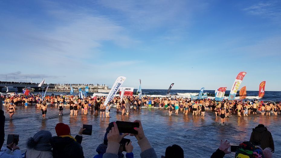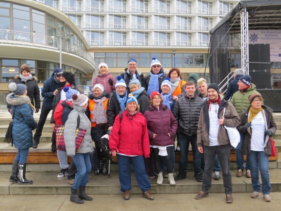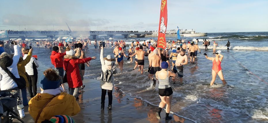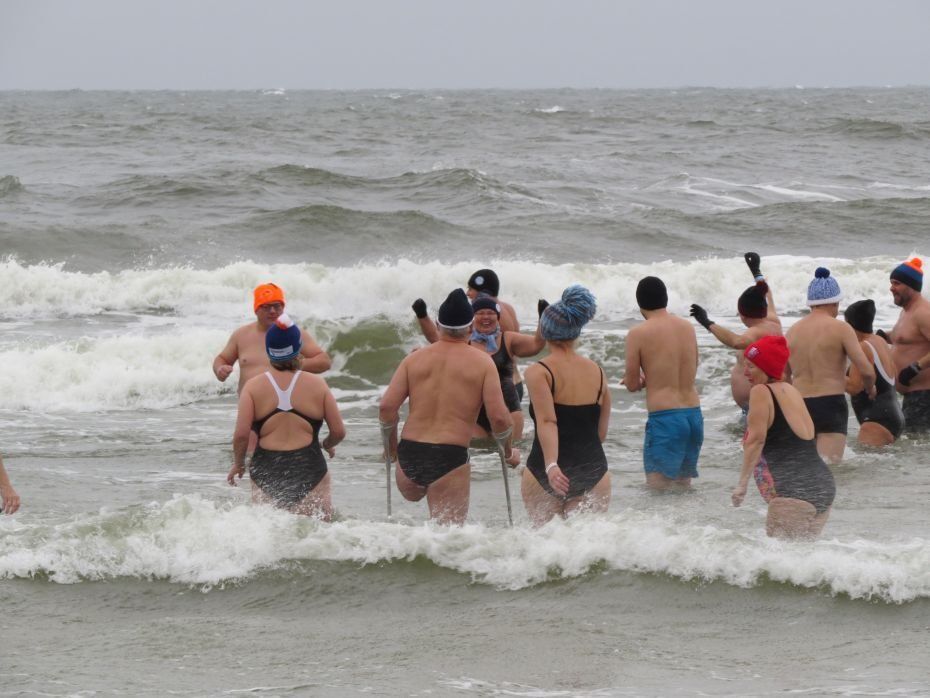 Am zentralen Strand an der Seebrücke trafen sich zahlreiche Eisbader verschiedener vor allem polnischer Vereine. Aus Deutschland waren nur die Schwedter Wassersportler angereist. Leider spielte das Wetter nicht ganz so mit. Es regnete am Freitag und Samstag fast durchgängig. Hoher Wellengang machte das Baden auch nicht einfacher. Aber Eisbader haben damit kein Problem. Gemeinsam mit Hunderten Gleichgesinnten stürzten sich auch unsere „Schwedter Neunaugen“ mehrmals ins Wasser. Die restliche Schwedter Delegation beobachtete in regenfester Kleidung mit Respekt das bunter Treiben.