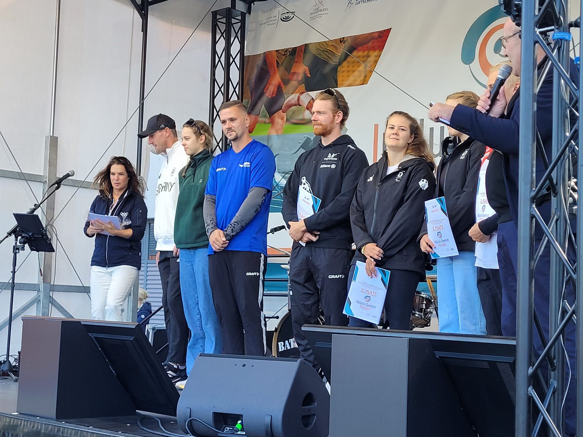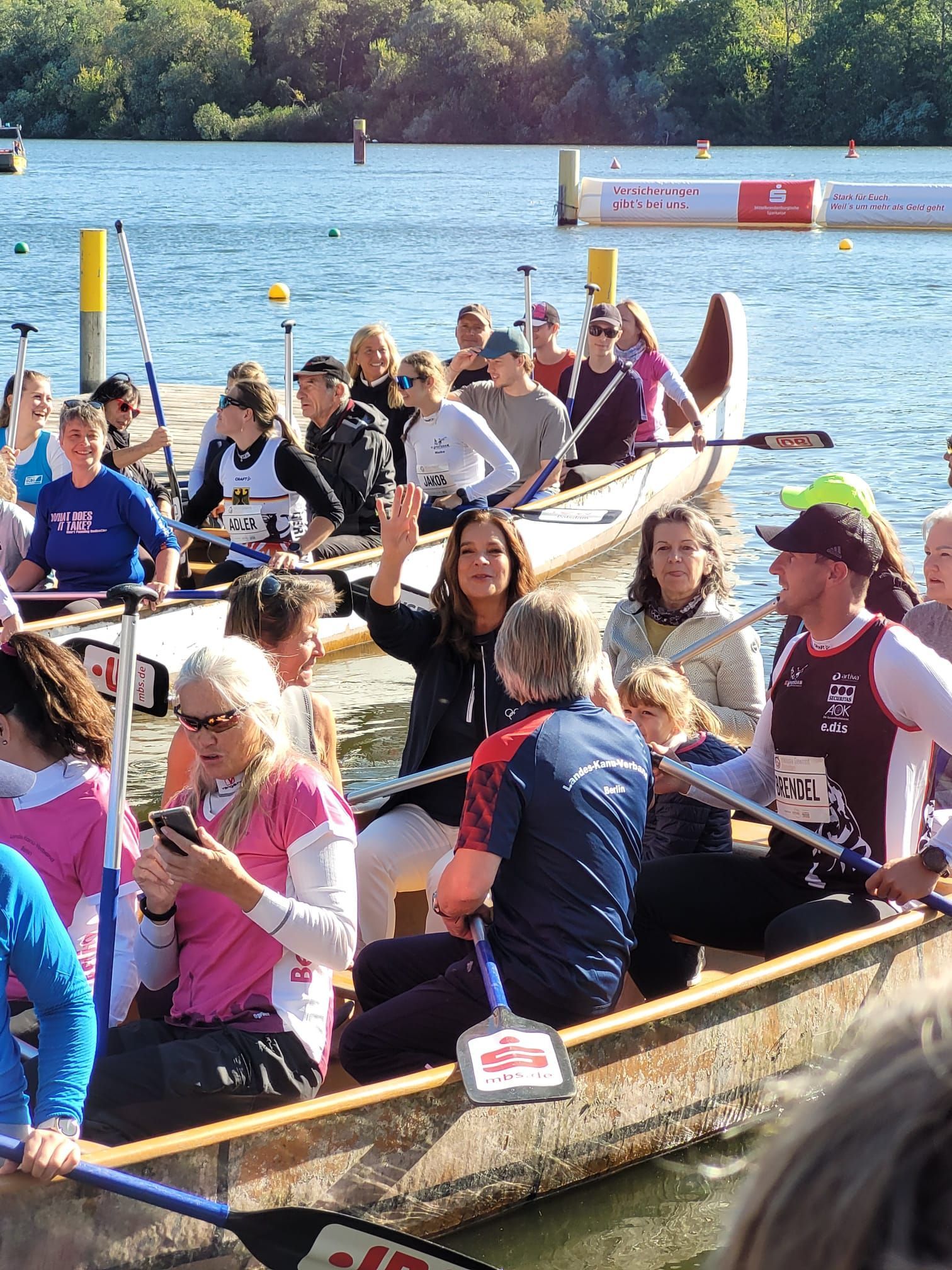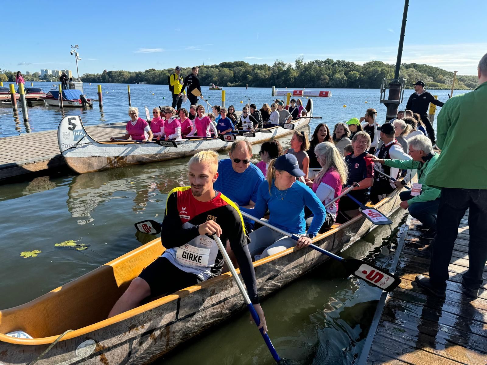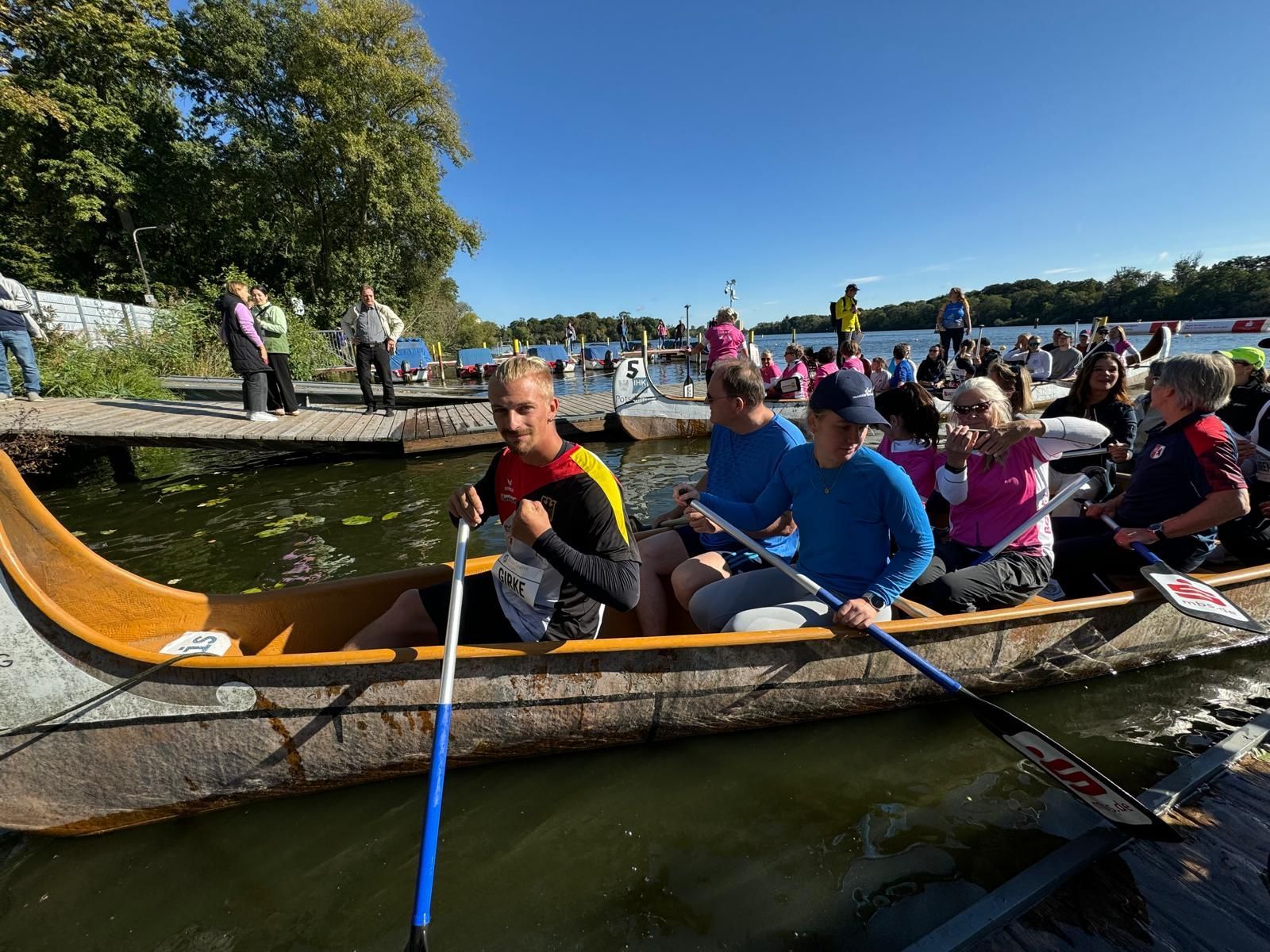 In der 4 x 200-m-Staffel wurde hart um den Sieg gepaddelt. Aus unserem Verein nahmen neben Sebastian auch Leona Johs und Stefan Glawe teil. Im Rennen in den riesigen 20er-Canadiern gab Sebastian als Schlagmann den Takt an. Hinter ihm paddelten Katarina Witt und Sebastian Brendel.
