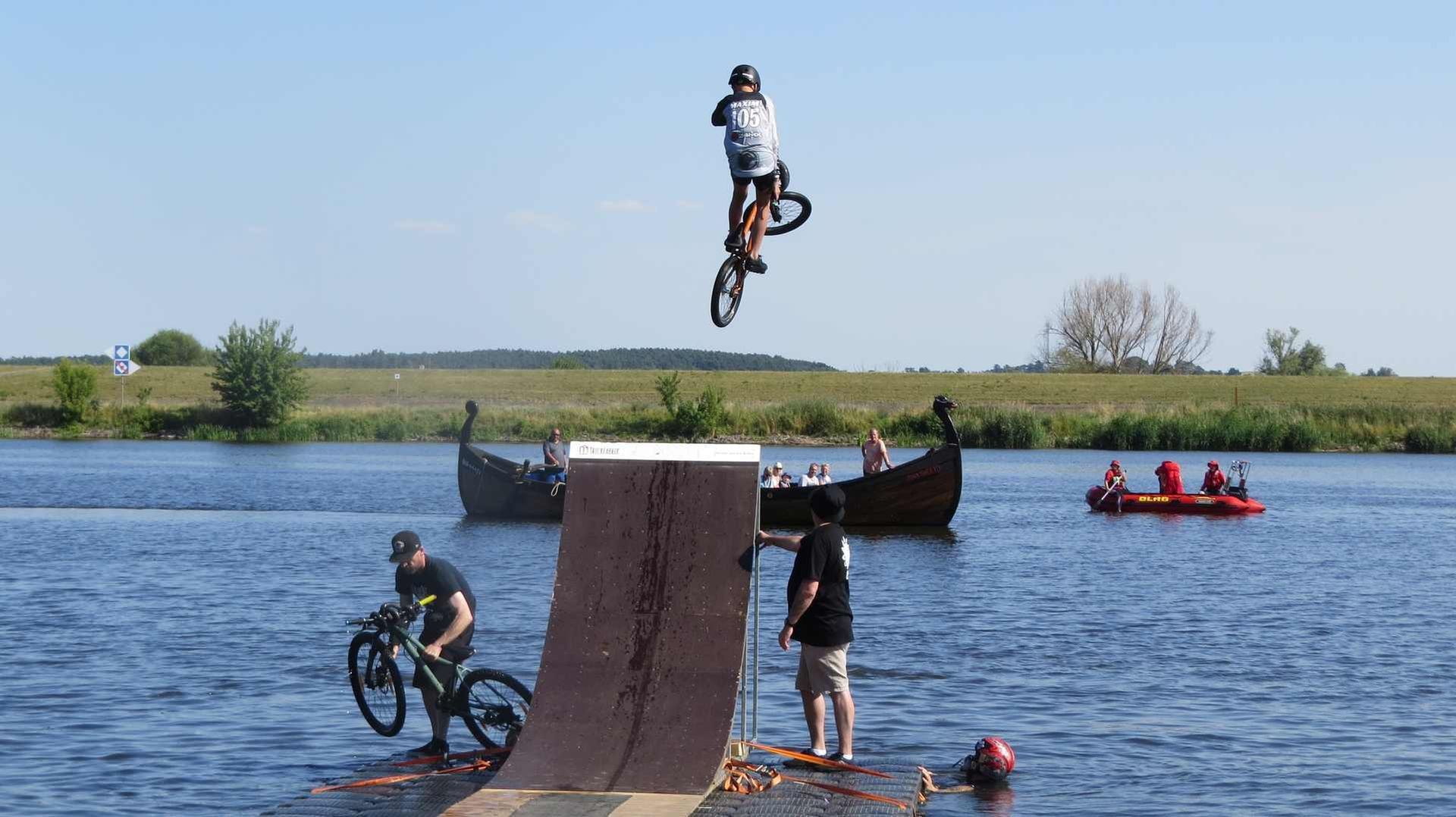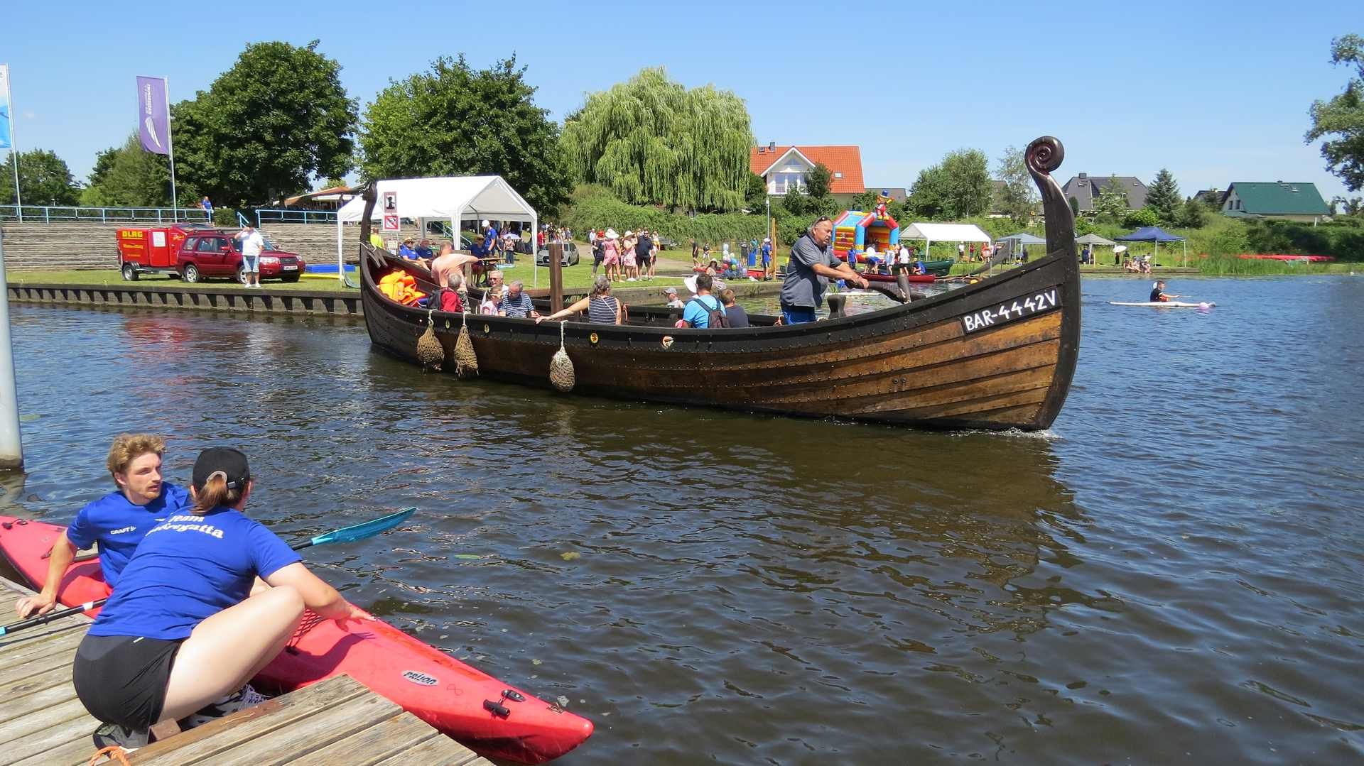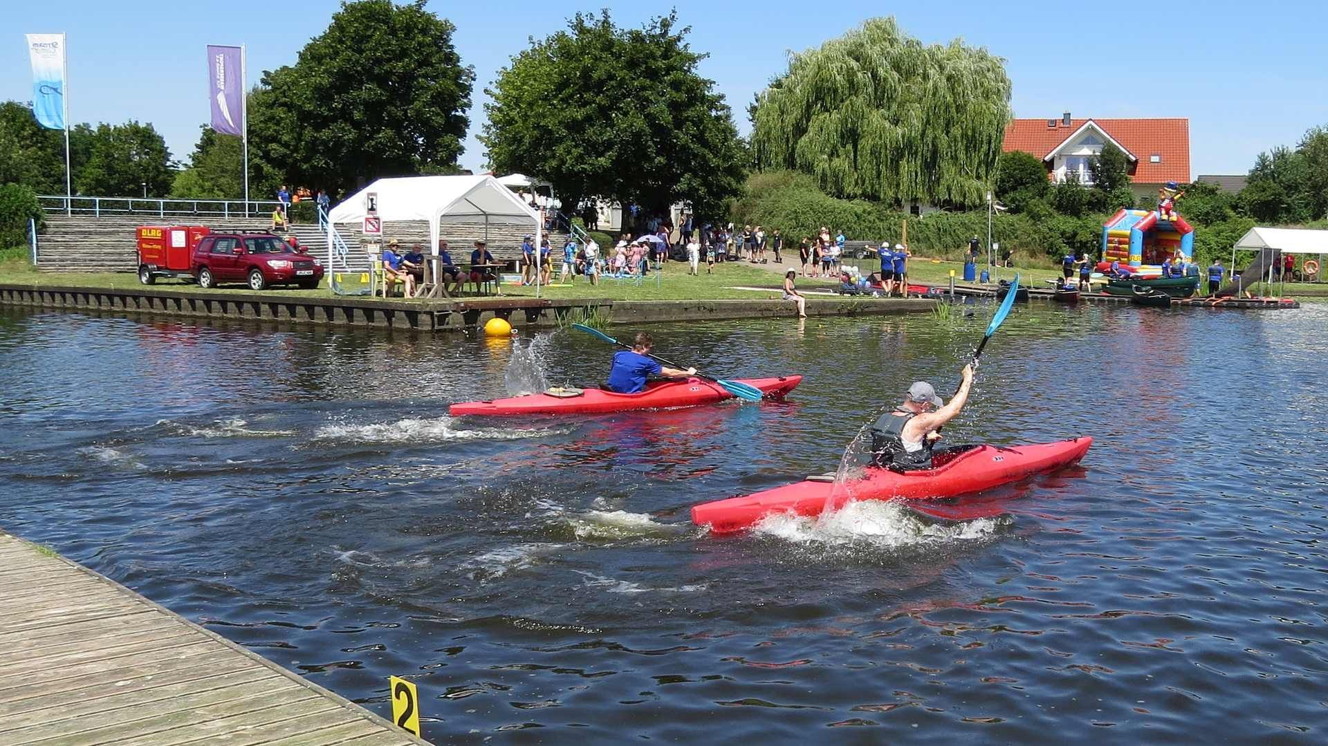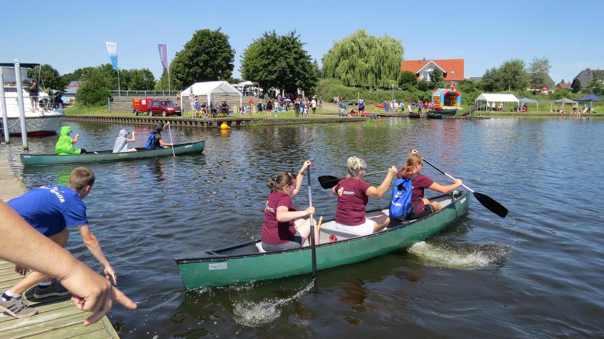 Neben der Spaßregatta mit 19 Mannschaften gab es auch einen Wettkampf unserer Specialkanuten, die BMX-Jumper zeigten ihre waghalsigen Kunststücke mit den Fahrrädern, das Theater Stolperdraht bot traditionell ein Theaterstück für die Kinder, die Feuerwehr war mit ihrem Feuerwehrboot auf dem Wasser. Und zwischendurch wurde noch ein Einatz abgesichert – unsere Hochachtung. Die Freunde der DLRG haben unsere Veranstaltung abgesichert und auch einen Rettungseinsatz vorgeführt. Die Siwa Sweeti drehte mehrere Runden auf dem Kanal. Zwischendurch zeigten einige Kinder aus dem Kitasport, was sie schon gelernt haben. Und wer auf den beiden Springburgen noch nicht genug getobt hatte, konnte mit einem Paddelboot eine Testfahrt machen. Die WOBAG bot Popcorn und Spielfahrzeuge für die Kleinen. Außerdem gab es reichlich Bastel-, Spiel- und Schminkangebote.