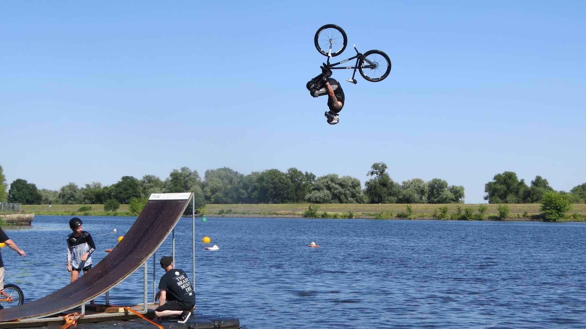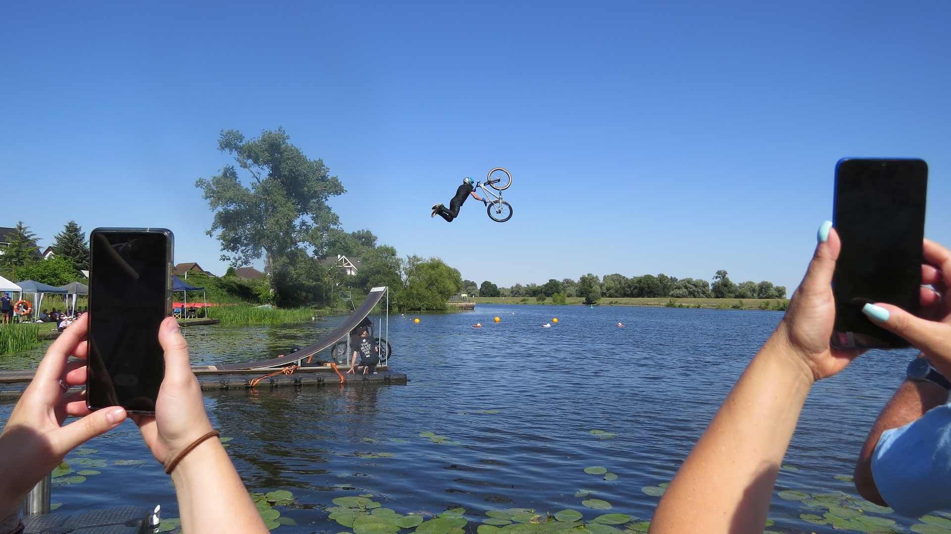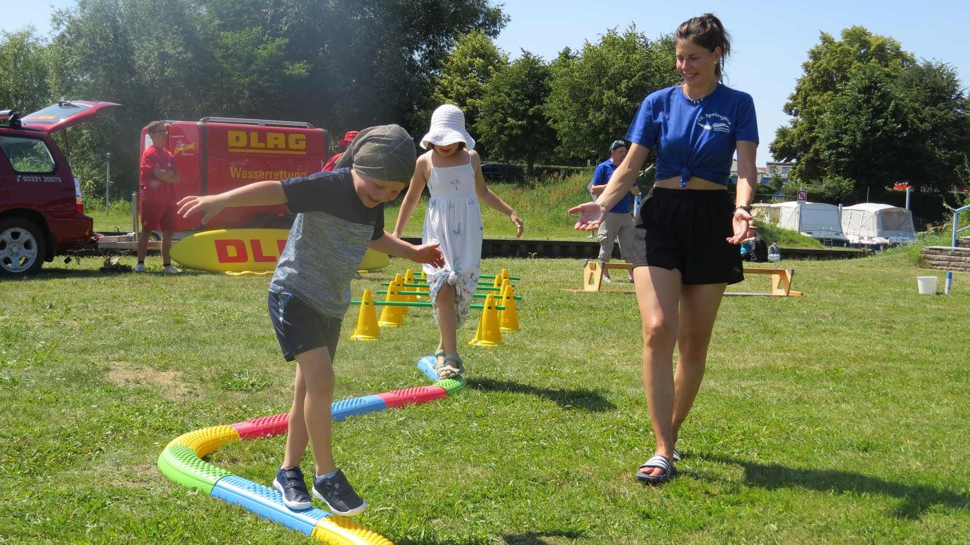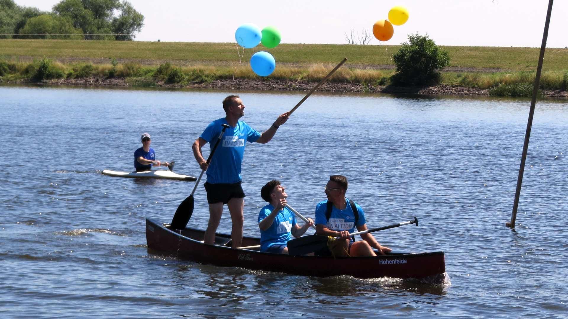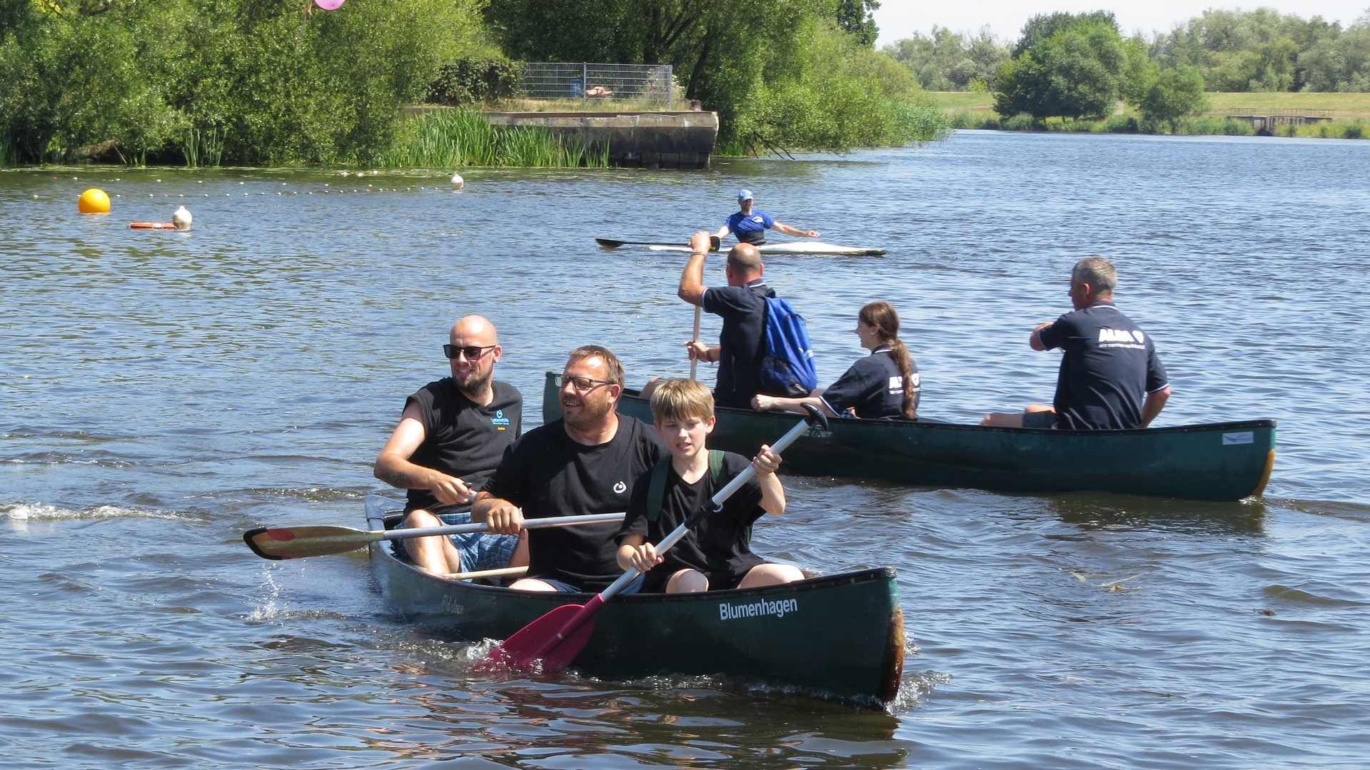 Neben der Spaßregatta mit 19 Mannschaften gab es auch einen Wettkampf unserer Specialkanuten, die BMX-Jumper zeigten ihre waghalsigen Kunststücke mit den Fahrrädern, das Theater Stolperdraht bot traditionell ein Theaterstück für die Kinder, die Feuerwehr war mit ihrem Feuerwehrboot auf dem Wasser. Und zwischendurch wurde noch ein Einatz abgesichert – unsere Hochachtung. Die Freunde der DLRG haben unsere Veranstaltung abgesichert und auch einen Rettungseinsatz vorgeführt. Die Siwa Sweeti drehte mehrere Runden auf dem Kanal. Zwischendurch zeigten einige Kinder aus dem Kitasport, was sie schon gelernt haben. Und wer auf den beiden Springburgen noch nicht genug getobt hatte, konnte mit einem Paddelboot eine Testfahrt machen. Die WOBAG bot Popcorn und Spielfahrzeuge für die Kleinen. Außerdem gab es reichlich Bastel-, Spiel- und Schminkangebote.