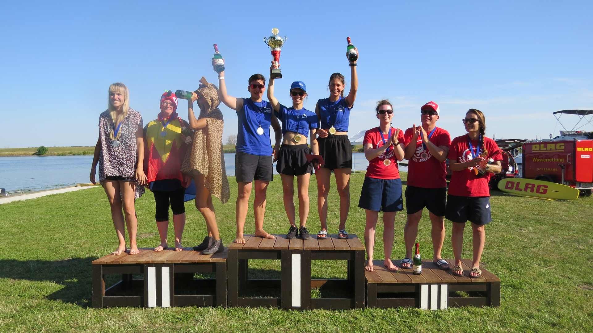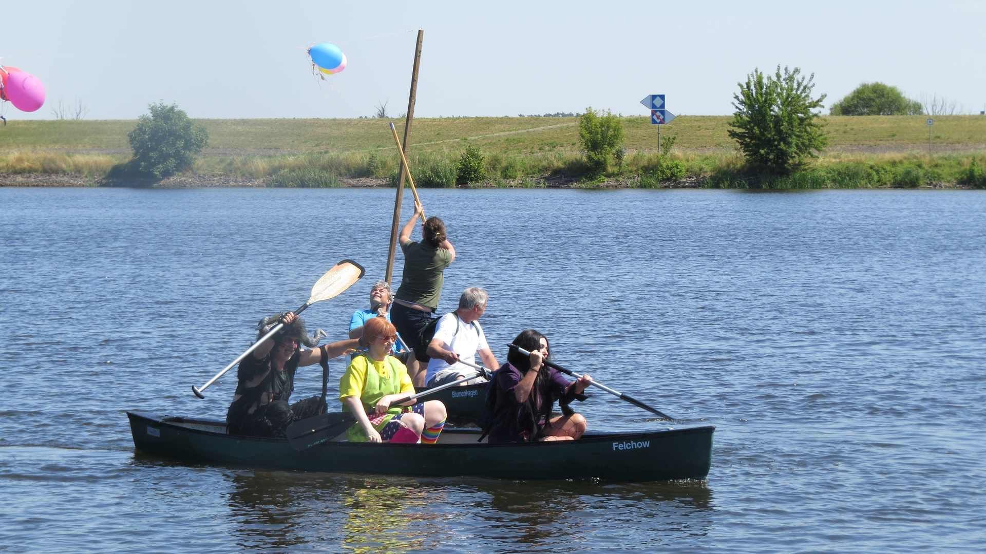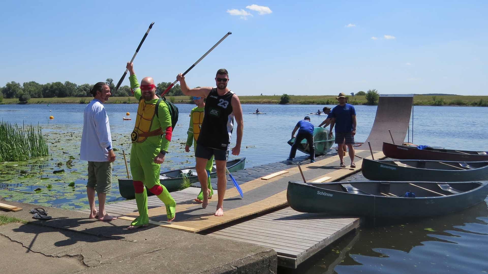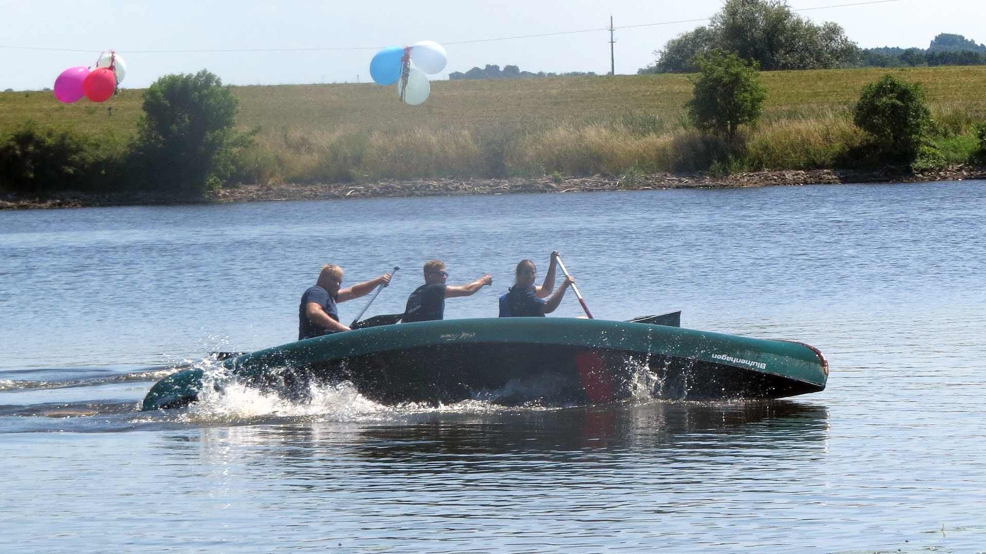 Das VIP-Rennen gewann wieder einmal das Boot „Politik“ mit André Nicke (ubs), Norbert Griem (KSB) und Mathias Heide (Lebenshilfe). Die „Wirtschaft“ mit Marco Kühn (Stadtwerke), Karsten Lange (Reinigungsservice Lange) und Jana Chmieleski (Nationalpark) sahen wie der klare Sieger aus – konnten aber am Ende den zu hoch hängenden Luftballon nicht zerstechen – und mussten so auch noch das Boot „Kultur“ mit den toll kostümierten Schauspielern der Uckermärkischen Bühnen vorbeiziehen lassen.