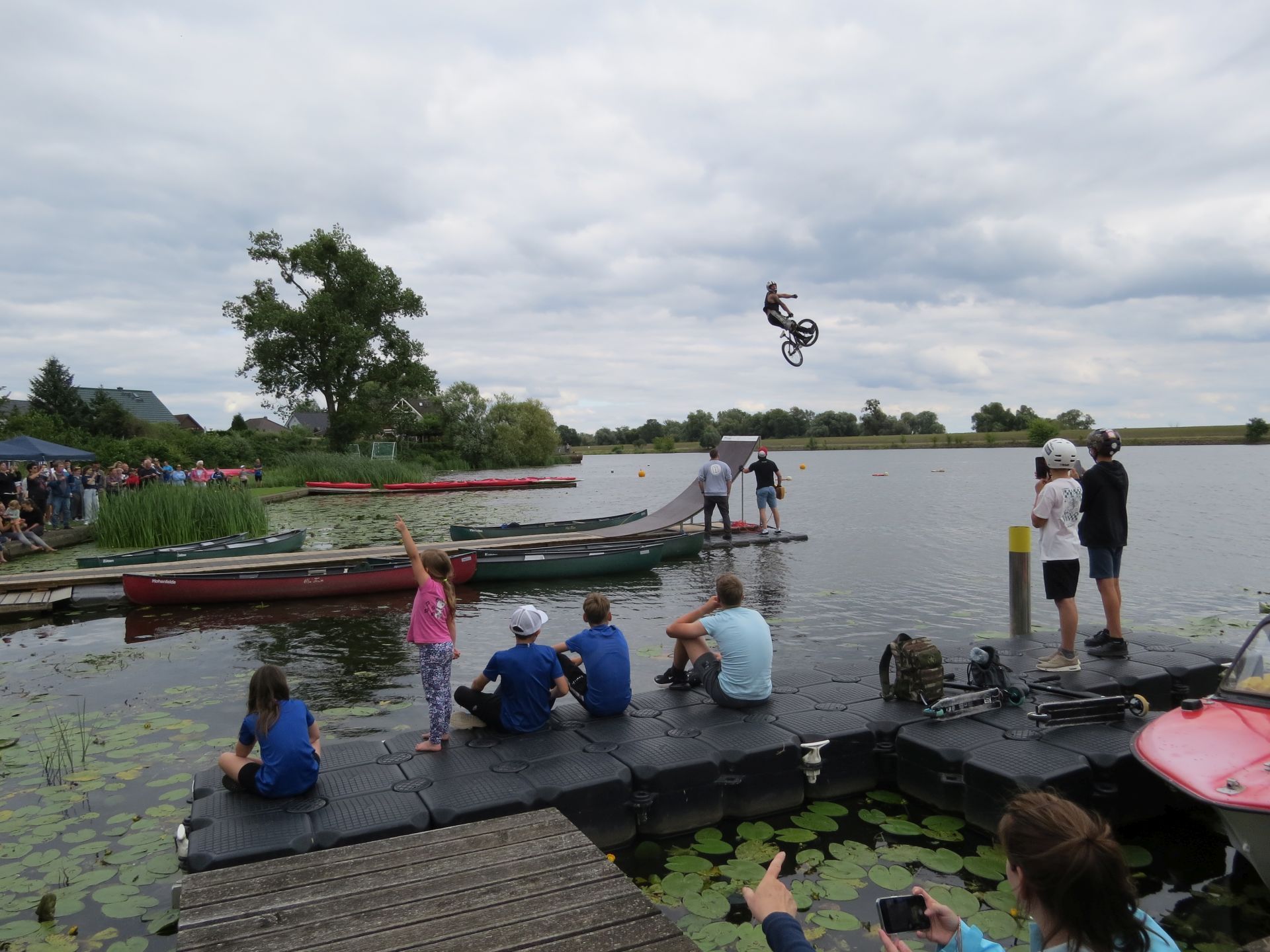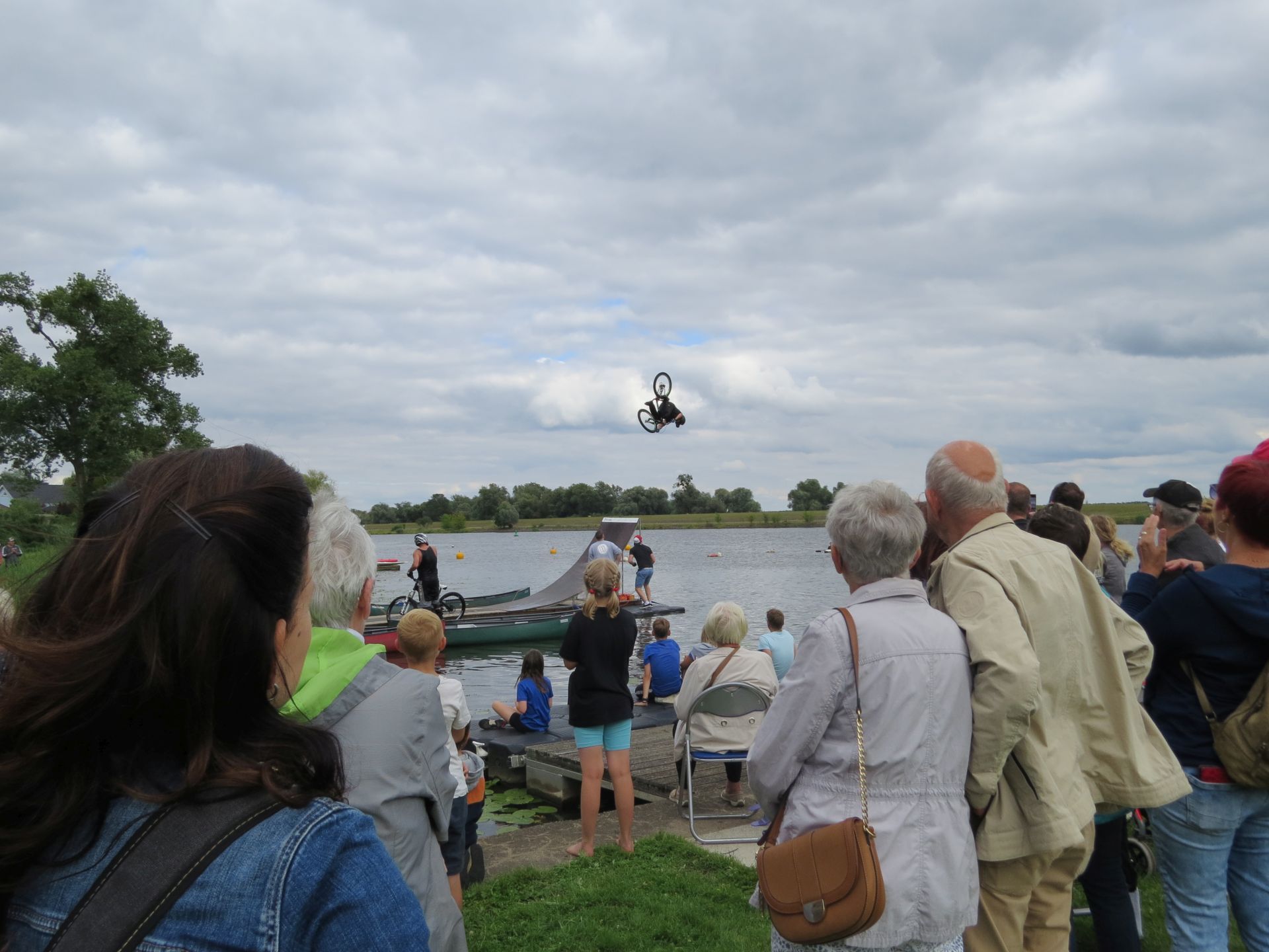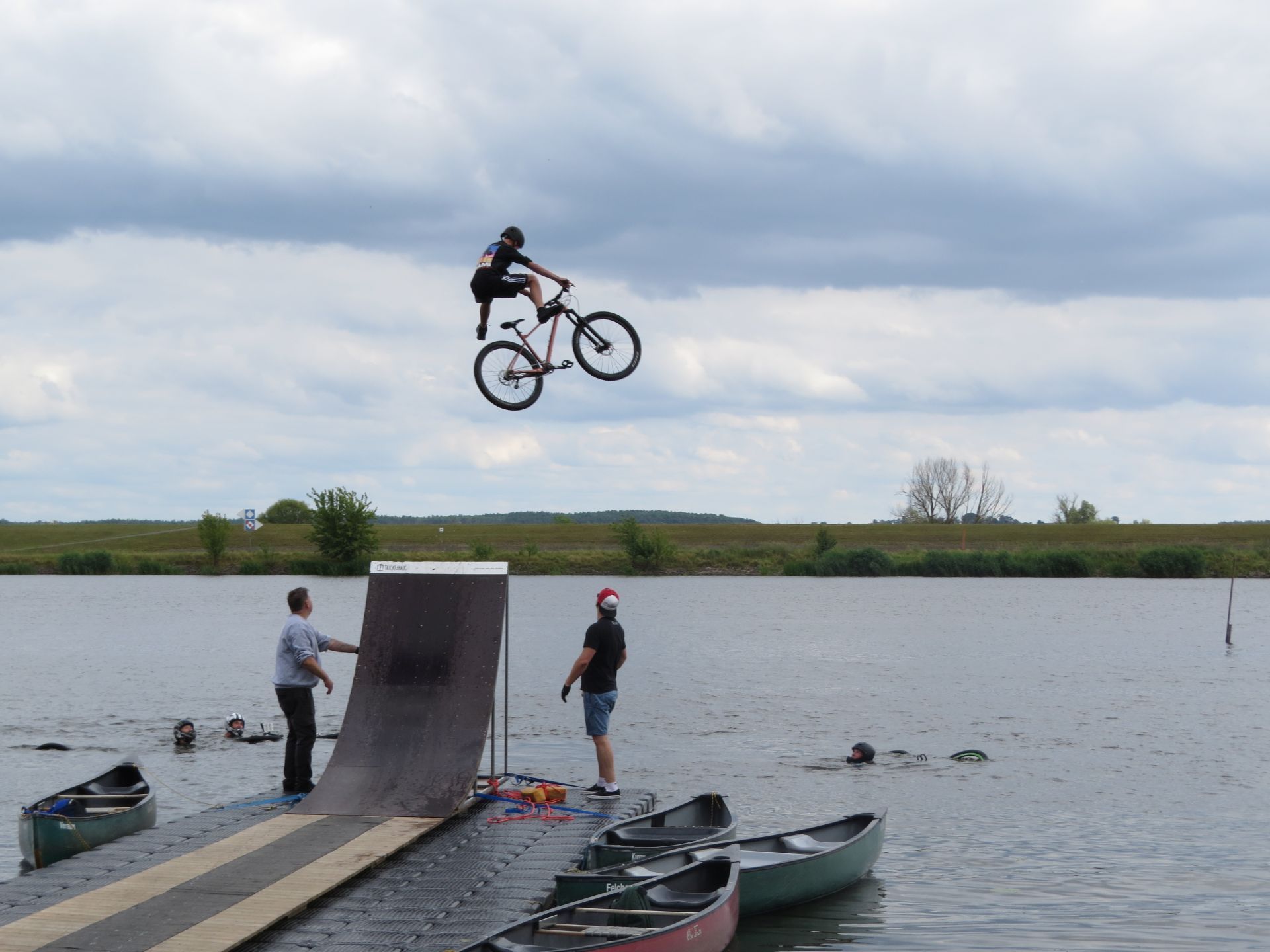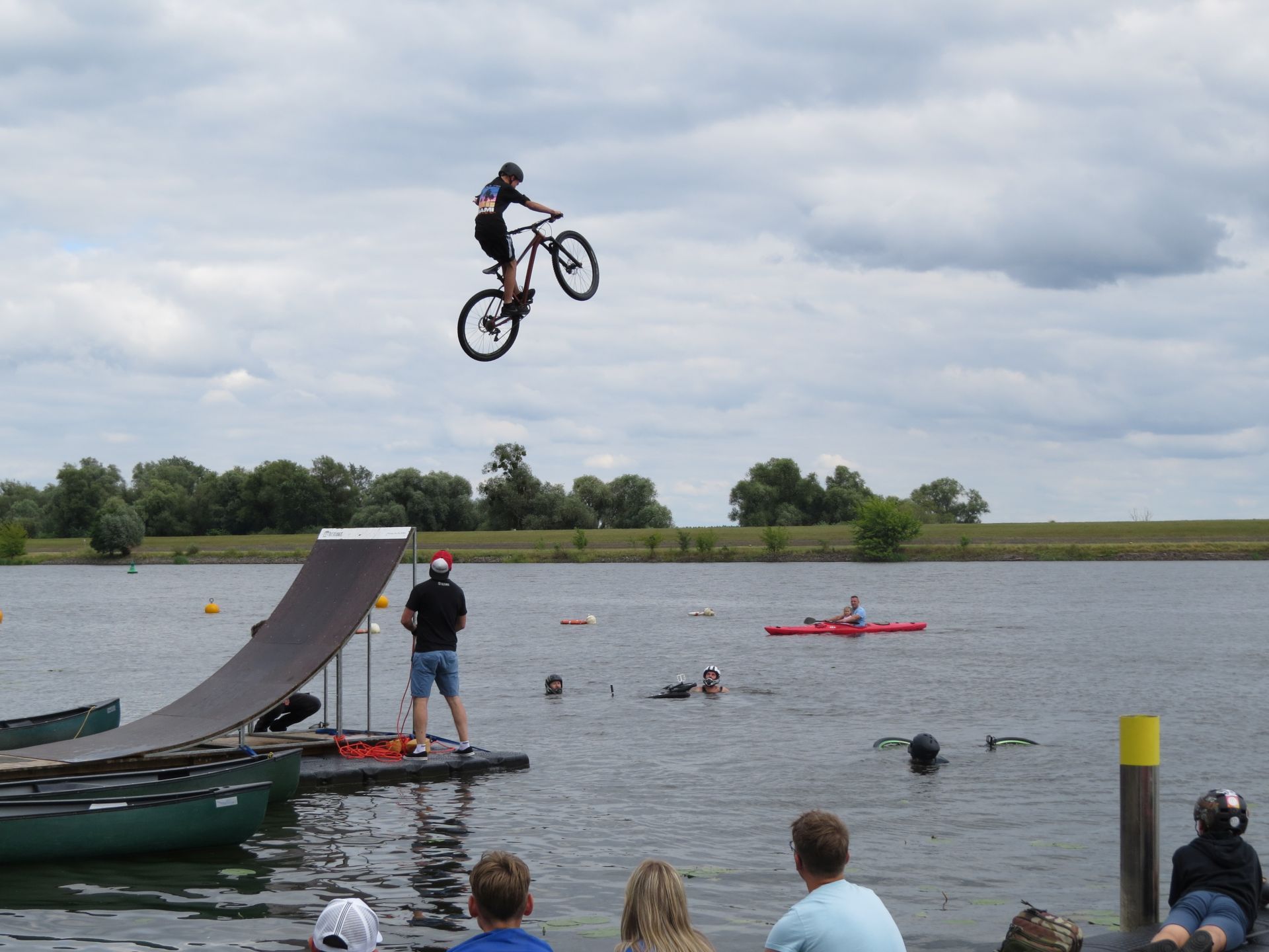 Mit 25 teilnehmenden Mannschaften bei der Spaßregatta, den Inklusionsrennen unserer Specials mit Gästen, der Präsentation der Abteilung Kanurennsport und natürlich den verrückten BMX-Jumpern der Trickfabrik war das Programm auf dem Wasser schon sehr attraktiv.