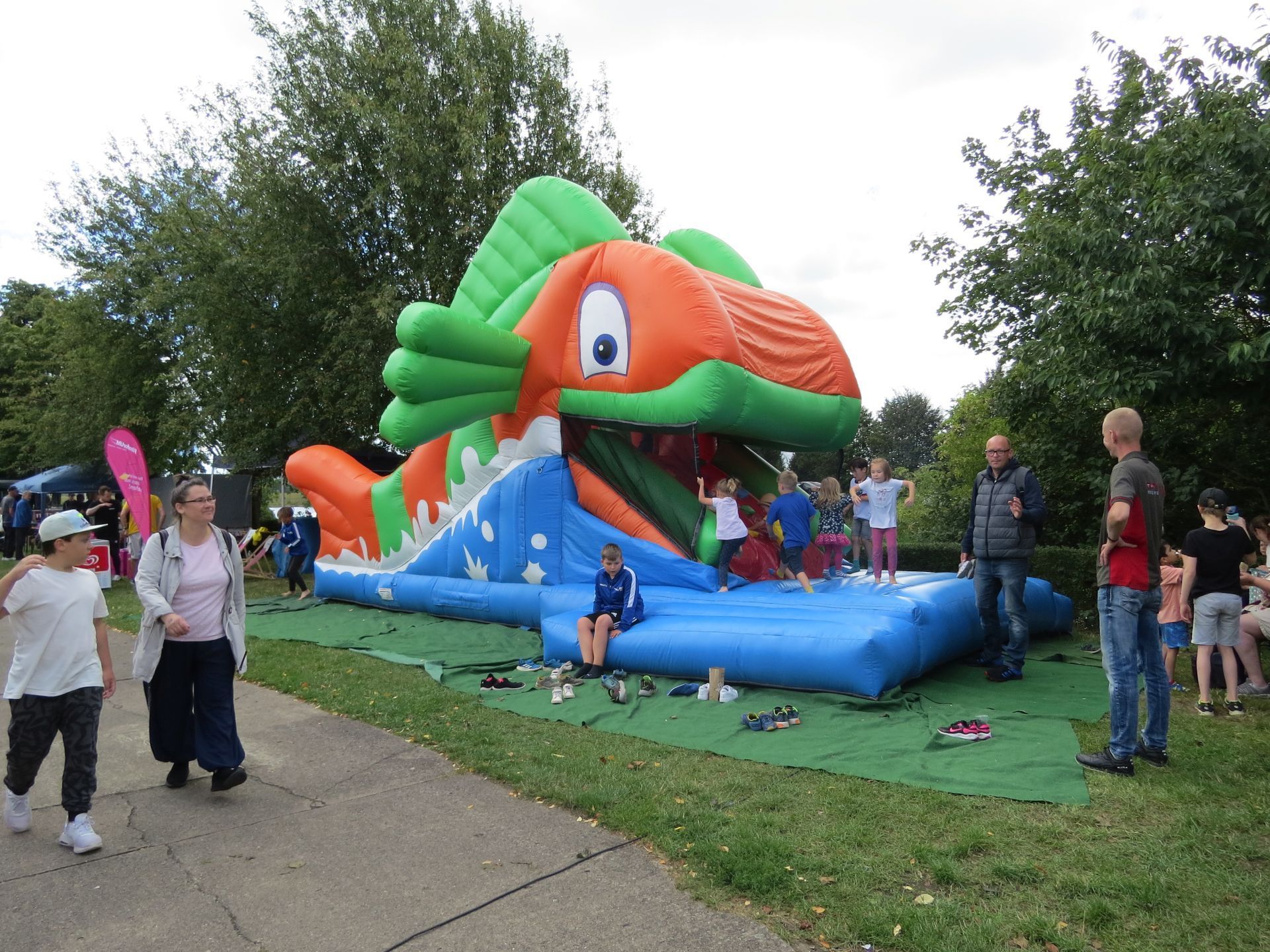 Aber auch an Land war viel los. Neben der schon traditionellen Aufführung des Theaters Stolperdraht ließen die beiden Hüpfburgen und viele Kinderspielmöglichkeiten mit Schminken, Basteln und Aktionen vor und in der Sporthalle keine Langeweile aufkommen. Dazu boten die Stände der Stadtwerke, der WOBAG und des Vereins Uckermark gegen Leukämie Infos und Aktionen.