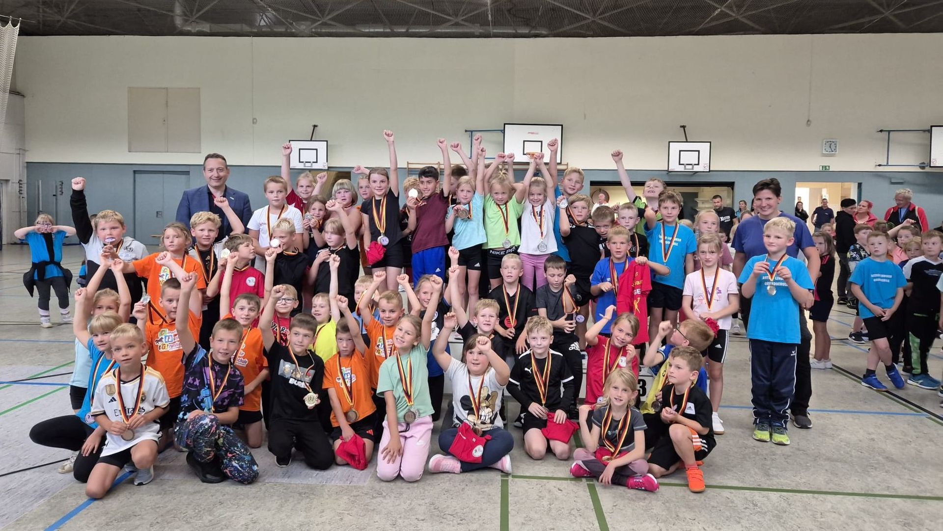 Nach dem Wettkampf fand ein wahrer Siegerehrungsmarathon mit 20 Siegerehrungen statt. Geehrt wurden in allen Disziplinen die jeweils 3 Erstplatzierten, unterteilt in die Jahrgänge 2017 und 2018 sowie nach Jungen und Mädchen. Wahre Medaillensammler waren diesmal die Klasse 2a der „Cornelia Funke Grundschule“ aus Passow mit insgesamt 10 Medaillen sowie die Klasse 2b der Grundschule „Am Waldrand“ mit 14 Medaillen. Erfreulich waren auch die Sportler der evangelischen Grundschule, die zum ersten Mal überhaupt Medaillen erringen konnten.